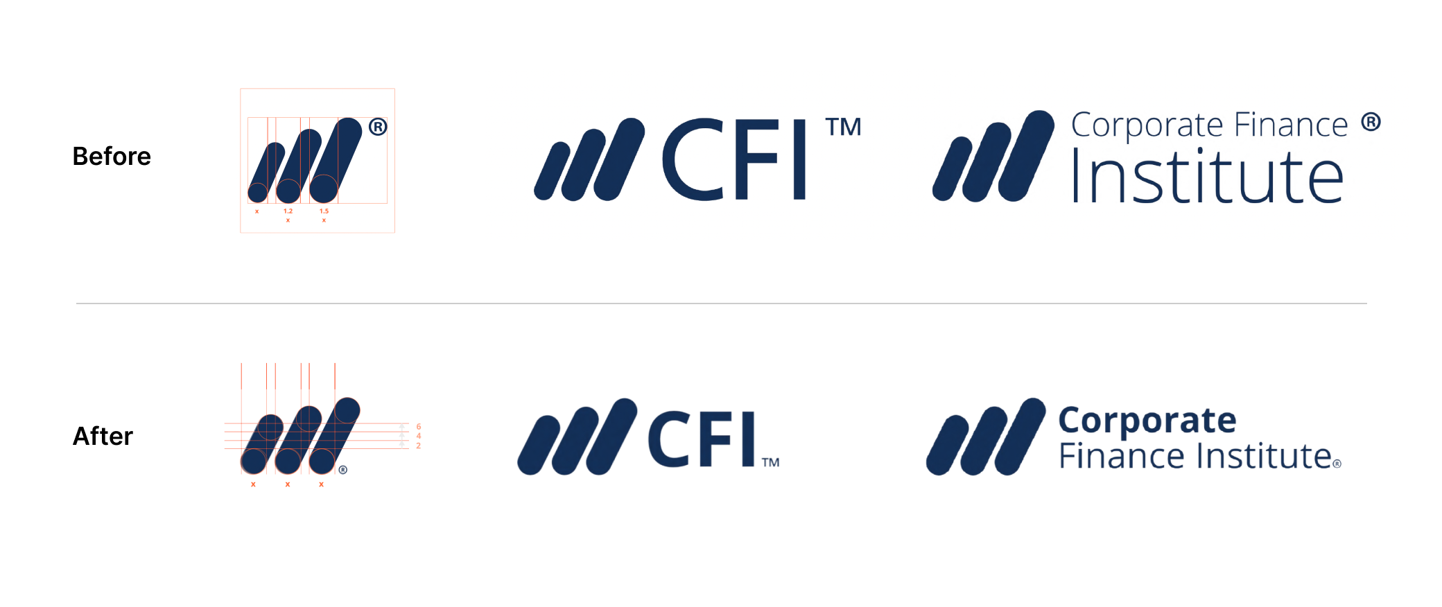 I led this effort and with the help of 3 product designers got to redesign the CFI logo with pixel-perfect precision, aligning the bars to an exact 18:28 ratio for clean scaling at any size. The proportions were balanced seamlessly beside the ® mark, while the typography matches the brand’s Open Sans family, now highly legible even at small sizes. The result was a technically sound logo that integrates smoothly into the broader design system, creating a consistent and cohesive brand foundation.